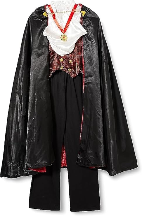 يتميز زي مصاص الدماء هذا بتصميم فاخر مع رداء طويل وياقة مميزة، مما يجعله الخيار المثالي للأطفال الذين يحبون الشخصيات المرعبة في الهالوين أو الحفلات التنكرية. يتضمن الزي سترة مع قميص مرفق وبنطال يناسب معظم الأطفال من سن 5 إلى 7 سنوات، بالإضافة إلى ميدالية تكمل المظهر.