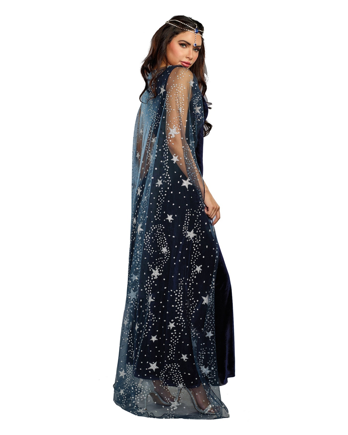 اجعلي دخولك لا يُنسى في هذا الفستان المخملي الأزرق الداكن الرائع مع عباءة شفافة مطبوعة برونق فضي متلألئ.