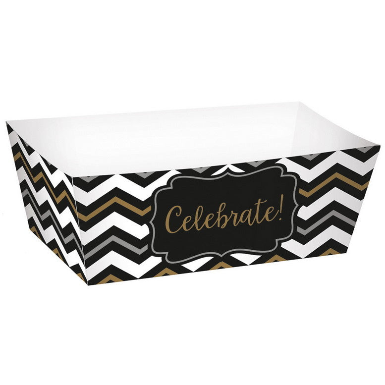 قم بتزيين المقبلات الخاصة بك في صواني الطعام الورقية باللون الأسود والذهبي والفضي. تتميز صواني الورق المستطيلة هذه بنمط شيفرون ممتع من المؤكد أنه سيلفت الانتباه إلى أطباقك اللذيذة.